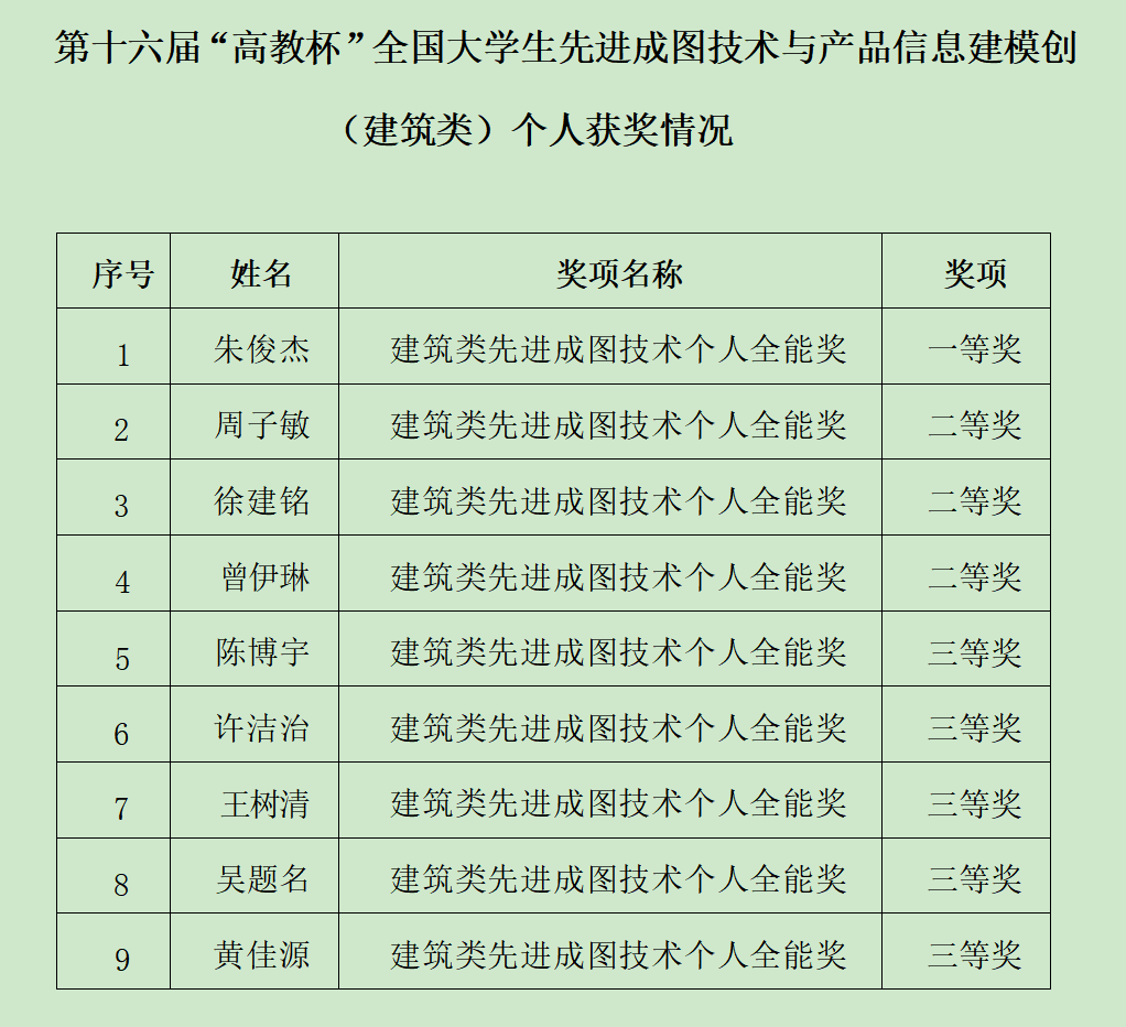 8月6日,第十六届“高教杯”全国大学生先进成图技术与产品信息建模创新大赛公布最终结果。我校荣获建筑类团体全国二等奖,其中学生获建筑类个人全能赛全国一等奖1项、二等奖3项、三等奖5项,BIM创新应用赛道全国三等奖1项,创造了我校在该项竞赛的历史最佳成绩。