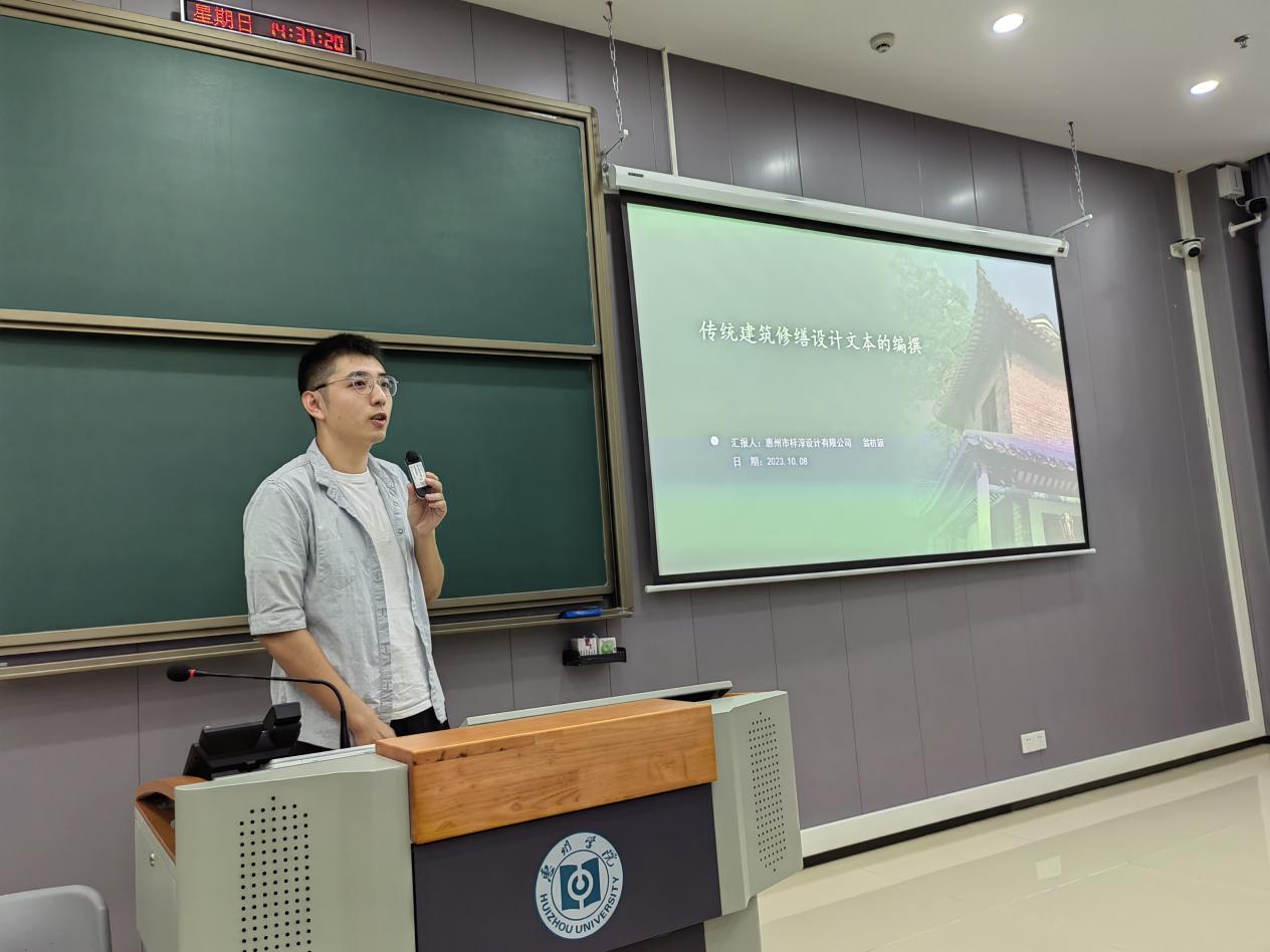 2023年10月08日下午,我院邀请惠州市梓淳设计有限公司2017届校友翁枋颖工程师为2020级建筑学专业开展题为“传统建筑修缮设计文本的编撰”的嵌入式教学。教学活动在旭日科技大楼A308课室开展,教学由本课程主讲教师杨星星主持,参与活动的教师有建筑学系副主任李孟;专任教师胡进彬、罗琛等。