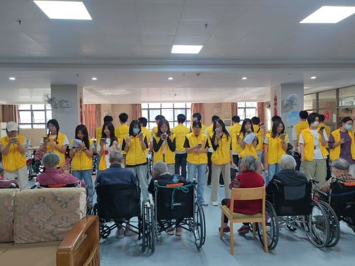 活动室内,团员们精心准备的文艺表演为老人们带来了阵阵欢笑。合唱《海阔天空》以悠扬的旋律拉开序幕,团员们用清澈的歌声传递温暖;充满活力的手势舞《你笑起来真好看》则展现了青年的朝气,感染了在场的每一位听众。不经手舞足蹈起来。跟着我们一起来舞动互动环节中,团员邀请老人一同参与手指操游戏,随着音乐的节奏拍手、伸展,现场氛围温馨而活跃。一位患有阿尔茨海默症的老人虽记不清名字,却全程跟着节奏哼唱,脸上绽放出孩童般的笑容,让在场人员深受触动。。文艺表演的最后,一位曾是音乐家的爷爷说要给我们来一首宏伟的《义勇军进行曲》,所有团员青年和老人们一齐高声歌唱。