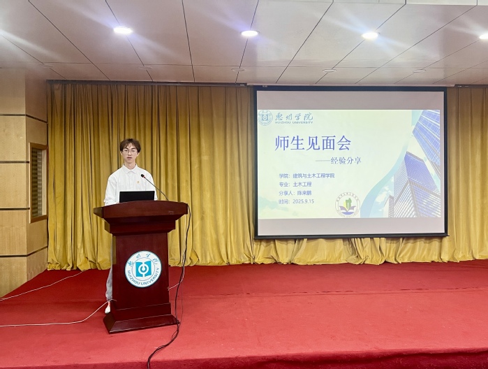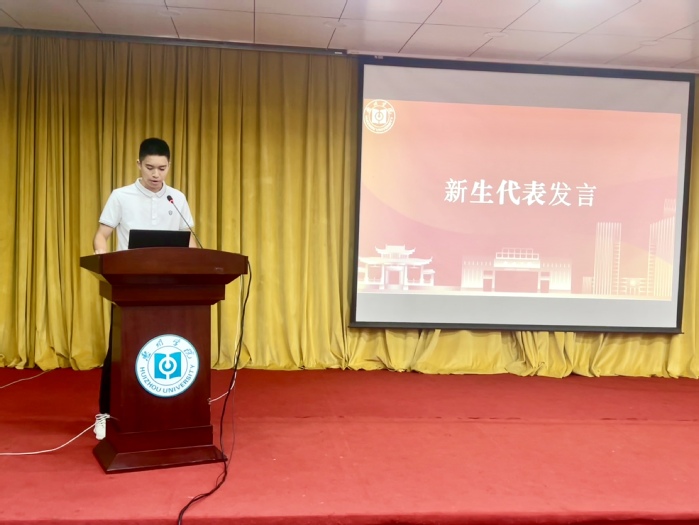 “国家奖学金”获得者、2022级土木工程专业学生陈来鹏作为老生代表发言。他结合自身三年来的学习和成长经历,向新生们分享了宝贵的经验。他从“适应大学生活、提升自主学习能力、积极参与学科竞赛与活动”等方面,鼓励学弟学妹们勇敢迈出第一步,积极竞选班委、参加社团活动,不断挑战自我、锻炼能力。陈来鹏还分享了自己从大一时的内向到后来担任班长、积极参与学科竞赛并获得全国大奖的成长历程。他表示,大学是一个自我发现、自我提升的舞台,希望新生们珍惜这段宝贵时光,设立阶段性目标,保持积极进取的心态,勇敢追逐梦想。