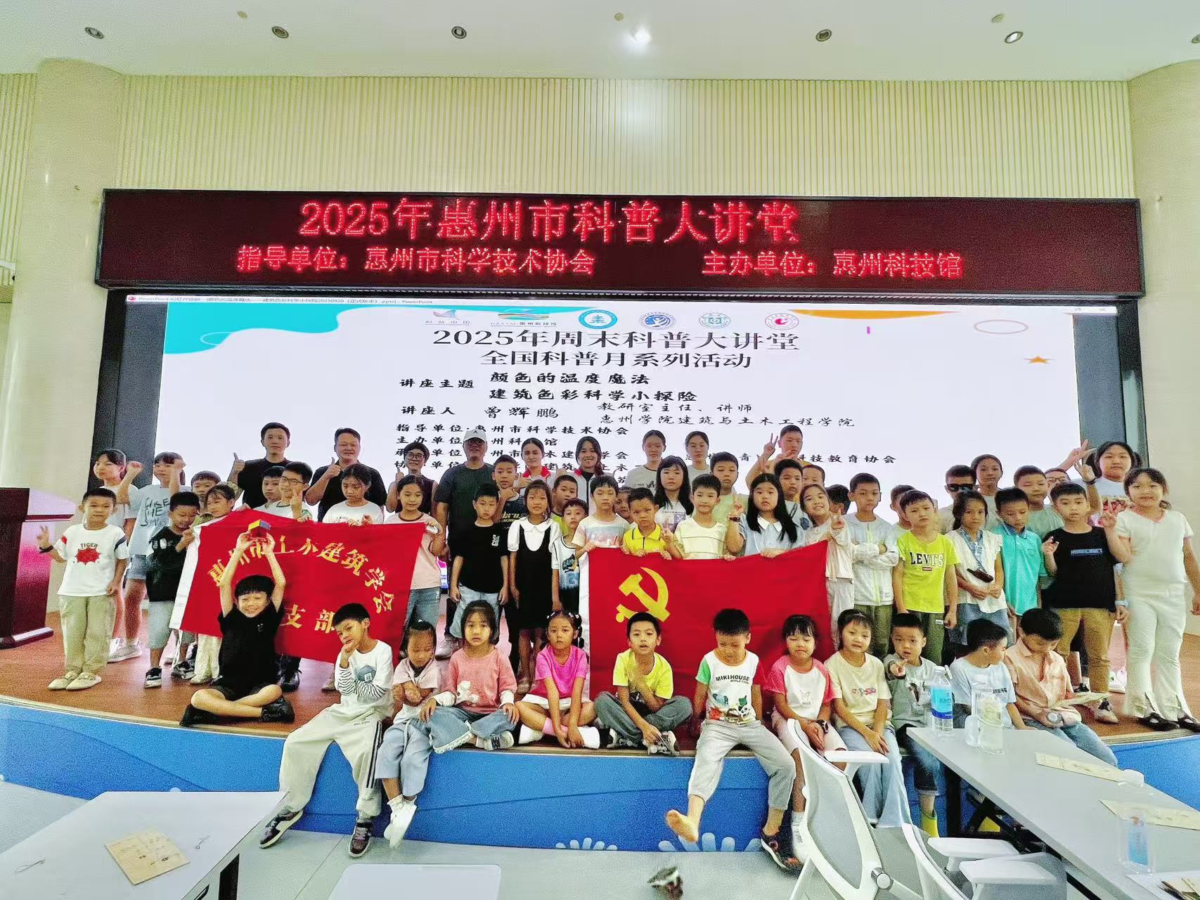 2025年9月20日,作为全国科普月系列活动的重头戏之一,“周末科普大讲堂”——《颜色的温度魔法:建筑色彩科学小探险》主题讲座在惠州科技馆圆满举行。本次活动由惠州市科学技术协会指导,惠州科技馆主办,惠州市土木建筑学会、惠州市青少年科技教育协会承办,我院作为重要支持单位之一,深度参与了活动的策划与组织工作。