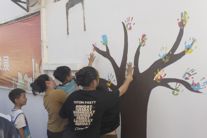 本次墙绘共分为三大板块:互动主题墙绘“希望之树”,村民、孩子与镇干部一同蘸取环保颜料,在墙上按下彩色手印,共同“种”下一棵象征希望与成长的参天大树。党建主题墙绘则以红色为主调,融合党徽、乡村元素,展现党建引领下的乡村新貌。儿童自由创作区孩子们在指导下自由绘制花朵、果实、小动物与卡通人物,释放想象力,展现童真色彩。